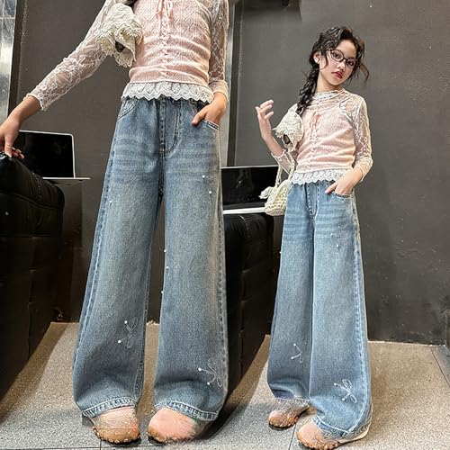 Girl's Bow Print Denim Pants Tween Elastic High Waist Basic Straight Leg Baggy Y2K Jeans Kids Vintage Cool Regular Trousers 7