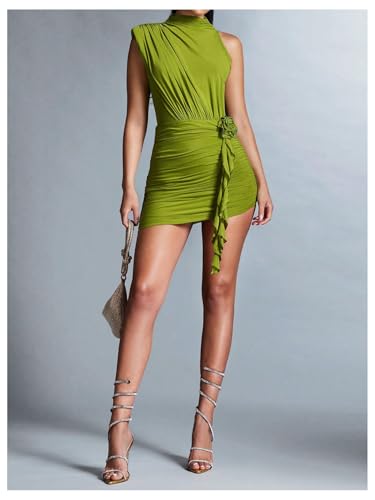 • Feature: 3D Flower, Sleeveless, Mock Neck,Ruched, Bodycon Short Dress for Women, Ladies