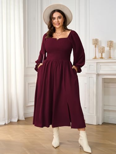 SCOMCHIC Womens Plus Size Maxi Dress Long Sleeve Square Neck Smocked Wedding Guest Flowy Split Fall Dresses with Pockets 6