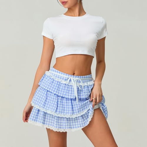 HOT ! Women's Summer Y2K Gingham Skirt Plaid Ruffle Low Waist A-Line Mini Skirts with Lace Hem for Going Out Dress