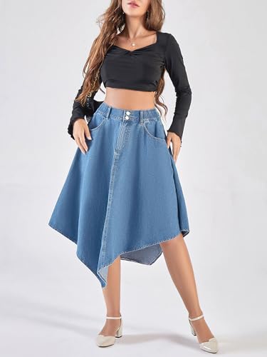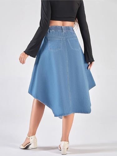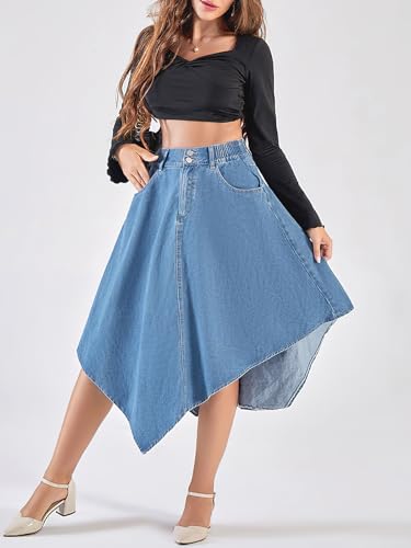 ebossy Women's Pleated Flowy Smocked Waist Handkerchief Hemline Denim Midi Skirts with Pockets 6