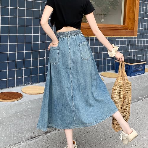 HOT ! Womens Casual Jean Skirt Elastic Waist Buttons Split A Line Long Denim Skirts with Pockets