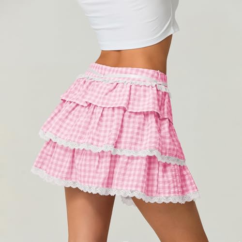 • Feature: Short flowy skirt: Tie-up waist, lace trim, plaid print, layered ruffle hem, above knee length.Cute nini skirts for women, y2k mini skirts for teen girls