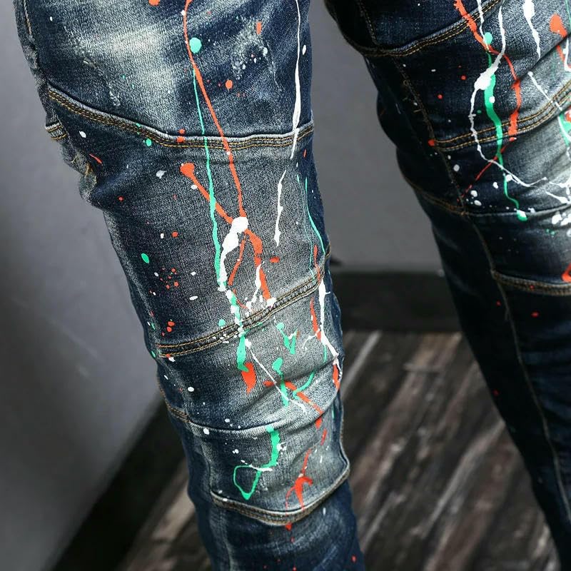 Street Men Jeans Retro Washed Blue Stretch Slim Fit Spliced Ripped Jeans Mens Painted Vintage Denim Pants 1