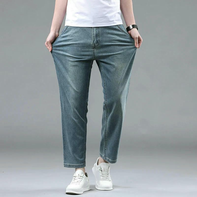 HOT ! Men’s Loose Fit Straight Leg Jeans Classic Mid Wash Denim Pants Casual Everyday Summer Cotton Ankle-Length Trousers