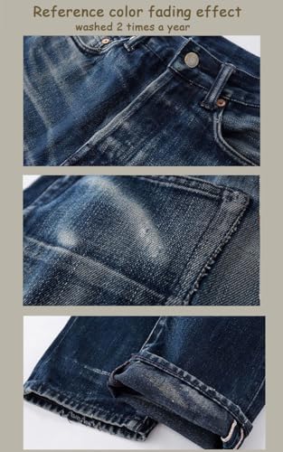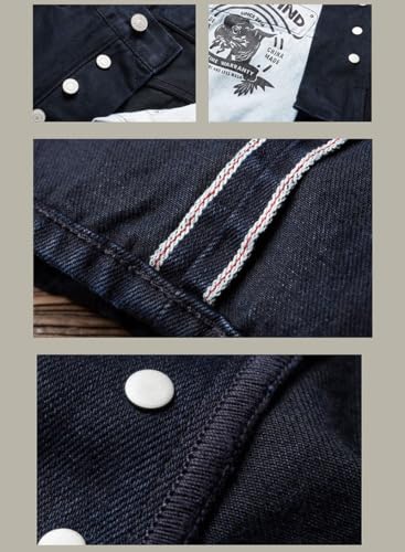 • RETRO RAW JEANS:This is Vintage jeans,Selvedge denim pants,it's Unsanforized,so after washing it will shrink about one size,the waist will shrink about 2cm,the length will shrink about 2-3cm;if you do not like tight fit,please buy 1-2 sizes larger; This men slim jeans is with red-line selvedge,mid-weight,14.5oz denim;Warp yarn and the weft yarn dyed that will fade over time.