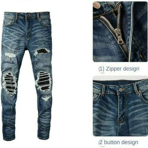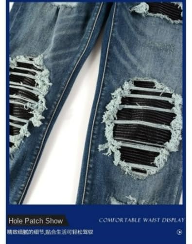 More information about Jeans Pants Trouser Denim Men Stretch Slim Fit Street Trendy Wear Worn Hole Blue Grinding Fading Wrinkle Patch Personalized Casual Small Foot Casual(Blue,31)