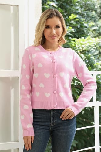HOT ! Women's Pink Heart Crew Neck Knit Cardigan Button Front Long Sleeve Cropped Sweater Spring Fall 2025
