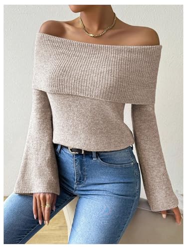 MakeMeChic Women's Off The Shoulder Sweater Bell Sleeve Rib Knitted Pullover Tops 6