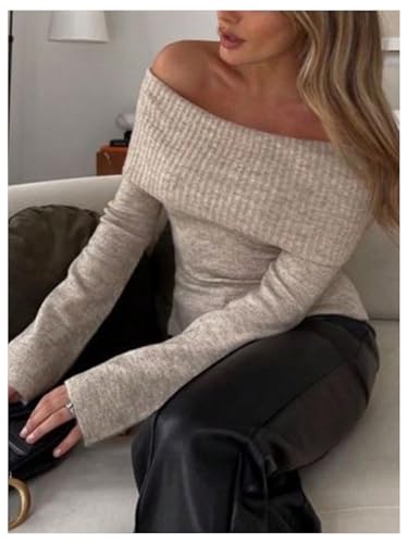 MakeMeChic Women's Off The Shoulder Sweater Bell Sleeve Rib Knitted Pullover Tops 1