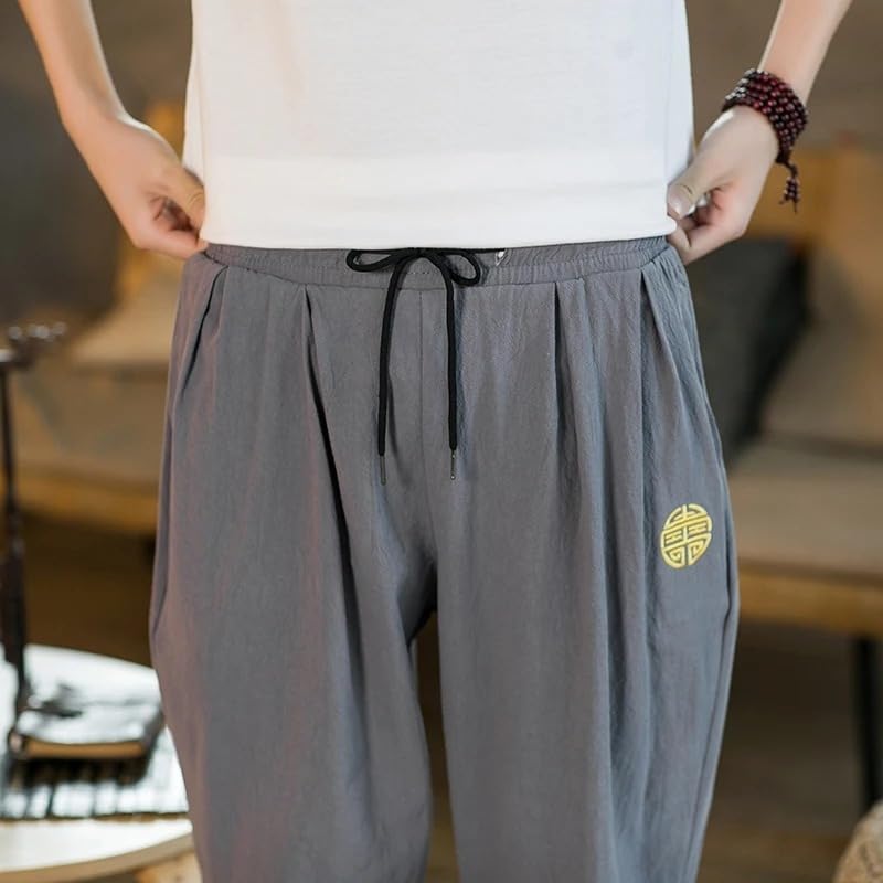 Summer Chinese Style Cotton Linen Casual Ninth Pants Men Embroidery Loose Harem Pants 1