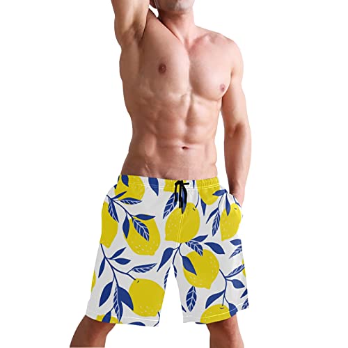 HOT ! susiyo Yellow Lemon Blue Leaves Men's Beachwear Swim Trunks Quick Dry Bathing Suits with Mesh Lining and Pockets
