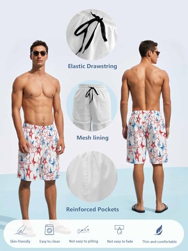 Mens Swim Trunks with Compression Liner,American Flag Stars Men's Inseam Board Shorts Quick Dry Bathing Suit for Men/Boys 5