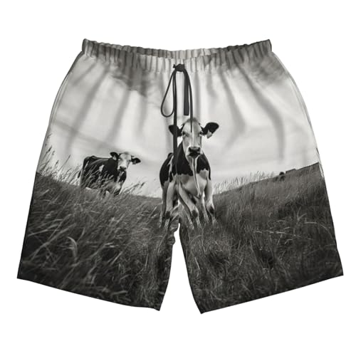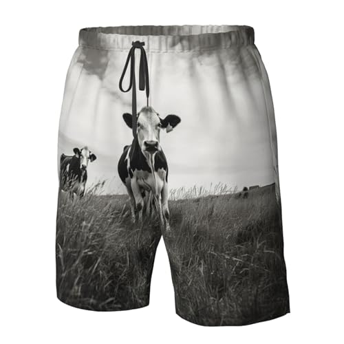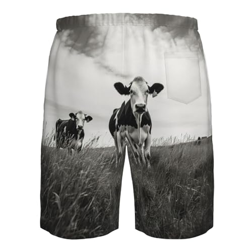 HOT ! Cow in Black Print Mens Casual Shorts Drawstring Summer Beach Stretch Shorts Novelty Swimtrunks
