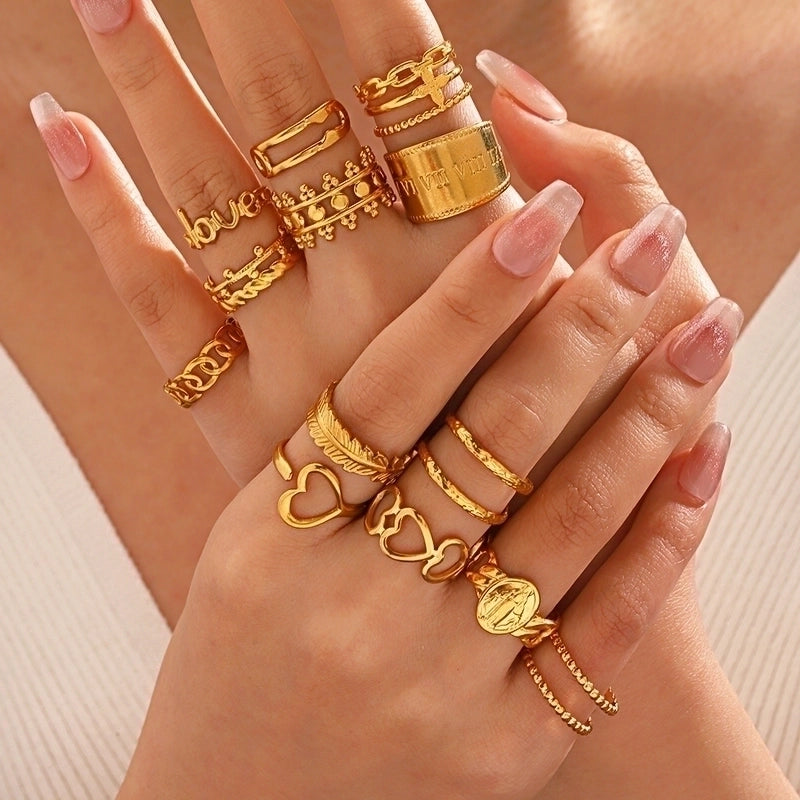 304 Stainless Steel 18K Gold Plated Minimalist Hollow Out Leaves Heart Shape Lines 304 Stainless Steel Open Rings 12