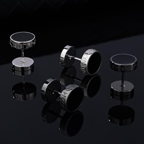 FEEL STYLE 925 Sterling Silver Viking Rune Stud Earrings for Men Women Natural Black Onyx Flat Back Stud Earrings Hypoallergenic 3