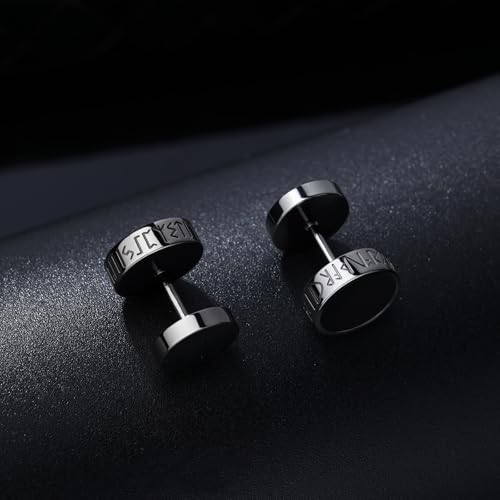 FEEL STYLE 925 Sterling Silver Viking Rune Stud Earrings for Men Women Natural Black Onyx Flat Back Stud Earrings Hypoallergenic 4