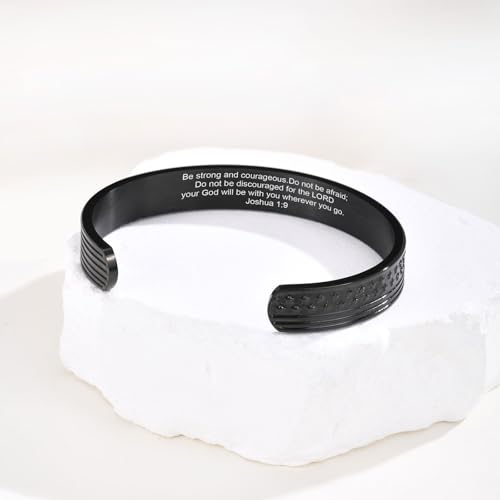 • Engraved Bible Verse & American Flag Design: This stainless steel black open cuff bangle features a powerful Bible verse and an American flag cross design, making it a meaningful and inspiring gift for men who value their faith and patriotism.