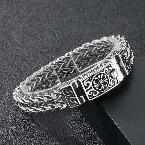 Men's 316 Stainless Steel Gothic Viking Bracelet - Flower & Cross Carved, Large Franco Textured Chain 7