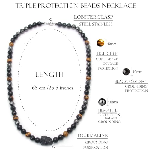 HOT ! Triple Protection Crystal Necklace for Men, COLORFEY Healing Crystal Tourmaline Necklace Real Tiger Eye Obsidian Hematite Beads Necklace for Men, Premium Mens Beaded Jewelry Gifts for Stress Relief