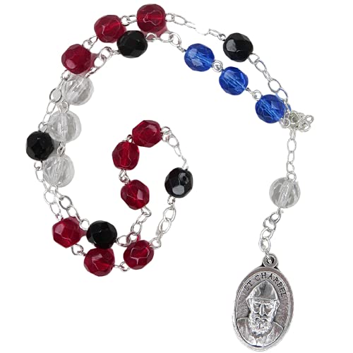 • ROSARY is made of connecting red, blue, and black crystal beads with a silver tone Saint Charbel Medal at the center that on the back reads "Pray for us".