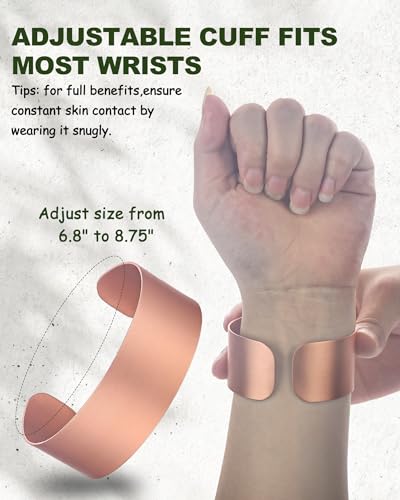 • [Adjustable Size] Our open-cuff copper bracelet effortlessly adjusts to fit wrists from 6.8" to 8.75", ensuring all-day ease. This pure copper cuff bracelet combines a customizable, secure fit with effortless style—ideal as a womens or mens copper bracelet. Crafted for those who value both the enduring beauty and natural benefits of genuine copper jewelry.