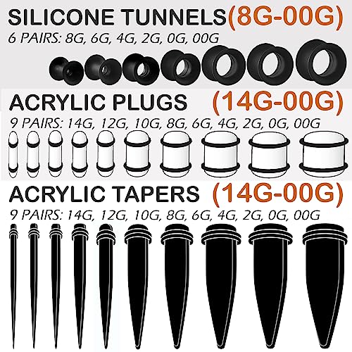 • COMPLETE GAUGING SET: Begin Ear Stretching Journey with 48-Piece Jewelry Kit - Solid Acrylic Tapers, No Flare Plugs with O-Rings, Flexible Silicone Tunnels and Jojoba Oil. Easy Start with 14G (1.6mm) and Gradually Go Up to 00G (10mm), Included Natural Aftercare Will Make Sizing Up Easy, Safe and Comfortable.