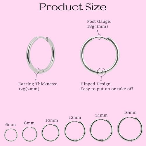 6 Pairs Hoop Earrings Set for Women, 316L Surgical Stainless Steel, Hypoallergenic Cartilage Hoop Earrings for Helix Tragus Conch Piercing Jewelry for Women Men(6-16mm) 5