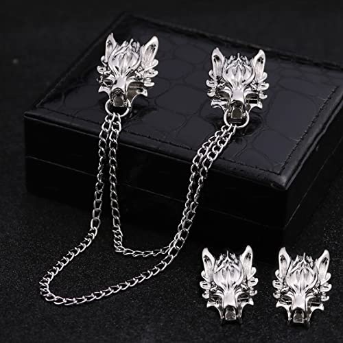 HOT ! 2PCS Wolf Head Long Collar Chain Brooch.Gold Silver Chain Tassel Brooch Pin,Punk Cool Animal Head Collar Coat Pin for Men's Suits Shirt Pin
