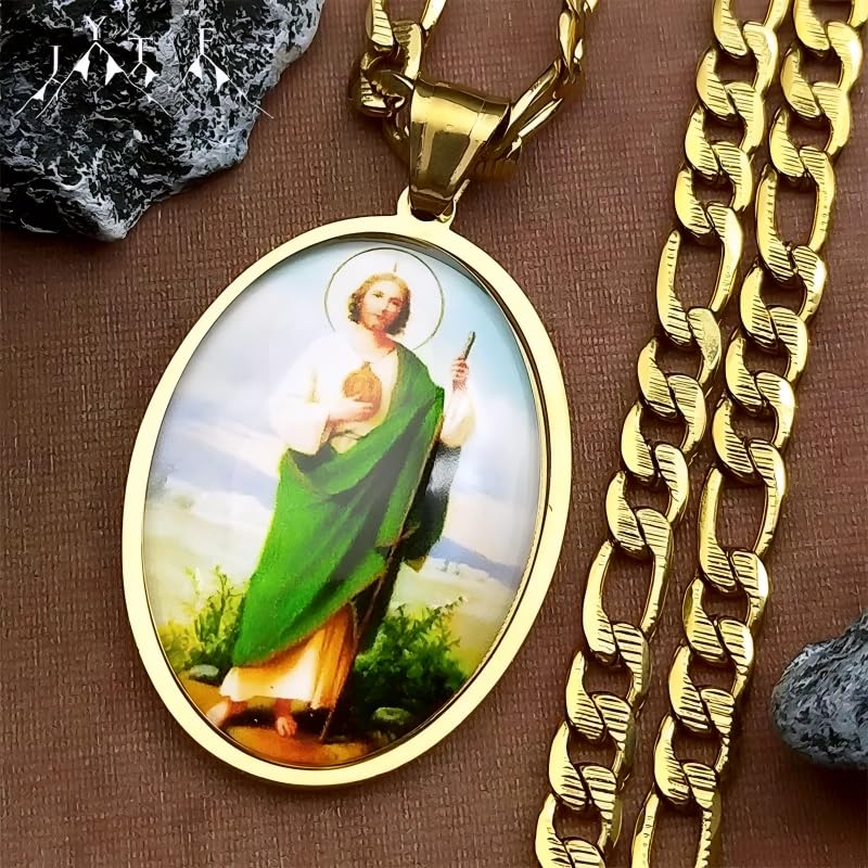 • ✝️ Saint Jude Medallion Pendant – Detailed depiction of Saint Jude Thaddeus, the patron saint of hope and miracles, offering protection and strength.