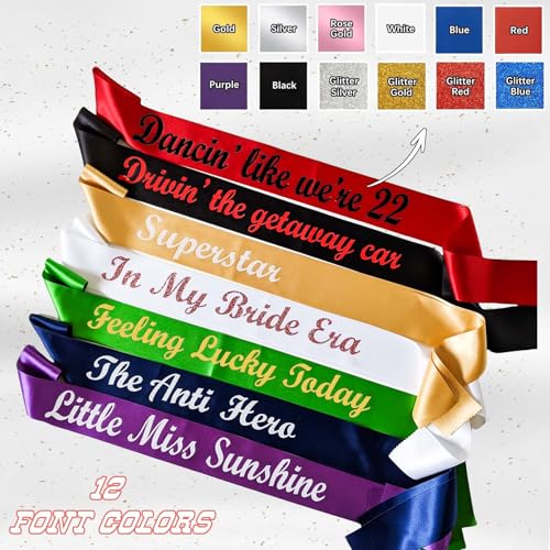 • Endless Customization Choices: Express yourself with a vast selection! Choose from 14 vibrant sash colors (White, Black, Gold Glitter, Rose Gold, Hot Pink, Red, Yellow, Navy Blue, Royal Blue, Purple, Sage Green, and more), 12 text colors. Design the perfect sash to match your theme or personality effortlessly. (Note: Screen colors may vary slightly).
