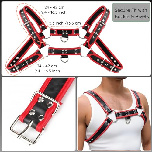 • Bold and Edgy Design: The chest harness features a striking combination of black and red PU leather, enhanced with metal rings and rivets. It provides a bold, fashionable look perfect for both casual and alternative styles