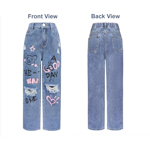 Baggy Jeans for Girls Graphic Prints Ripped Wide Leg Pants Streetwear Adjustable Waist Cute Jeans for Girls Y2K 9-12Y 1
