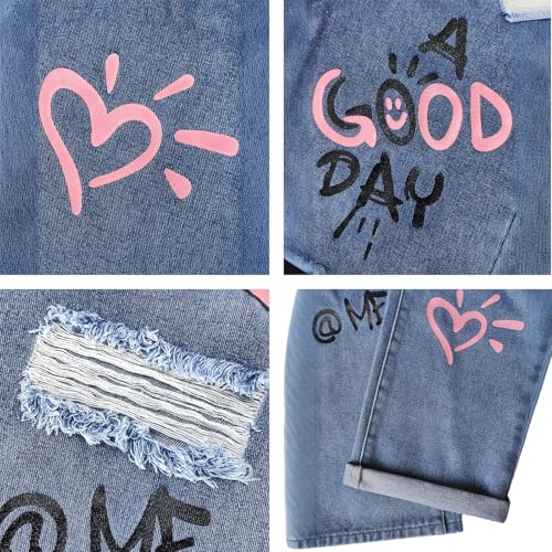 • [Stylish Design]: The jeans feature eye-catching graffiti graphics, including handwritten text, cartoon faces, and playful symbols, bring playful and fashionable flair to your girl’s outfit.