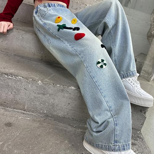 Girls Cute Coconut Tree Graphic Jeans Wide Leg Loose Elastic Waist Comfy Summer Kids Denim Pants for 5-15 Years 6