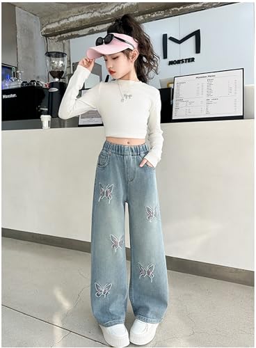Girls Jeans Butterfly Denim Elastic Wasit Wide Leg Baggy Pants Kids Clothes 5-16 Years 7