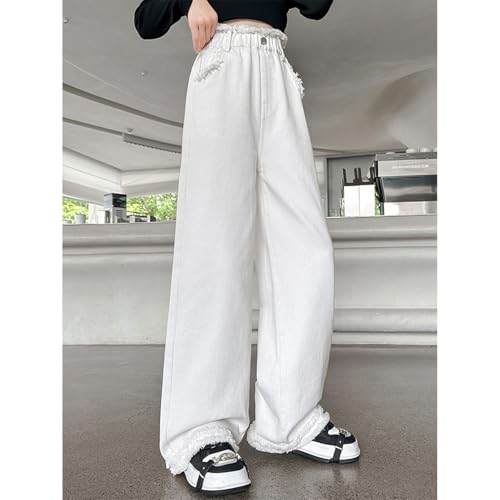 • Trendy Raw Hem: Teen girls straight leg jeans with classic 4 pocket, raw hem, loose fitting, high waist and elastic waist details. Kids girls denim pants, stylish frayed detailing at the back adds a touch of trendy style.