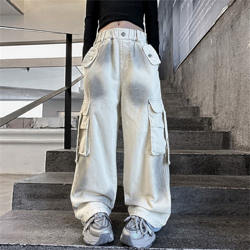 HOT ! Kids Girls Denim Cargo Pants Casual Baggy Wide Leg Jeans High Waist Floor Length Jeans with Multi Pocket