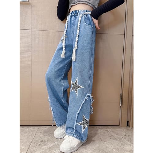 • Cute Star Design: Kids pull on denim jeans with classic 4 pockets, wide leg, loose fitting, high waist and elastic waist details. Big girls denim pants, y2k kids cute star detailing at the knees adds a touch of trendy style.