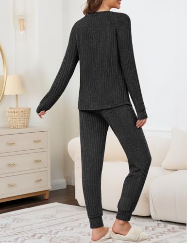 JUSTFASHIONNOW Womens Ribbed Knit Lounge Set 2 Piece Outfits Long Sleeve Pajama Set Loungewear Jogging Sweatsuits 5