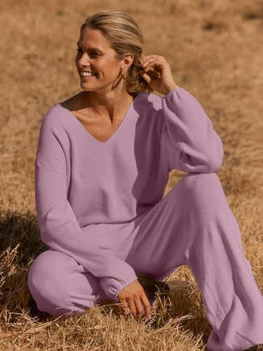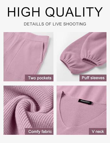 • Feature: Long lantern sleeve, v neck, drop shoulder, rib knit pullover sweater top and wide leg pants, elastic high waist, two pockets, solid color, loose fit, comfy knitted sweater active sets.