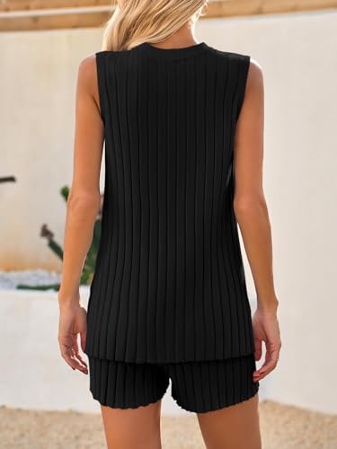 Tankaneo Womens 2 Piece Summer Outfits Knit Sweater Sets Sleeveless Ribbed Tunic Tops and Shorts Vacation Beach Lounge Set 2
