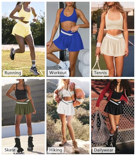 • 【2-in-1 Design】: This running shorts for women features a smooth with a matte finish, flowy silhouette, striped cross waist design, elastic and high V-cross waistband, built-in shortie underneath with 2 side pockets. The crossover design ensures a secure and comfortable fit, allowing you to move freely without any worries of them slipping down during workouts.