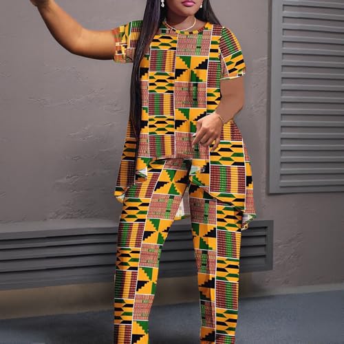 African Print 2-Piece Set, Short Sleeve Top with Wide Leg Pants, Traditional Kente Pattern, Yellow Green 1