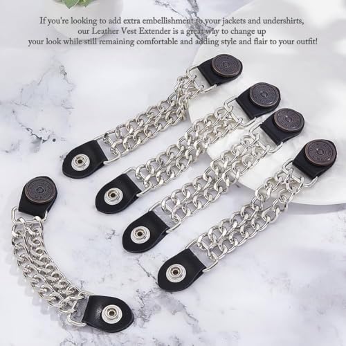 • 5Pcs Faux Leather Biker Vest Extenders: You will receive 5 Pieces Motorcycle Vest Extenders, whether you want to replace your undershirt extension chain or make a cool undershirt, this is a good choice. Perfect for motorcycle enthusiasts who are looking for fashion and practicality.