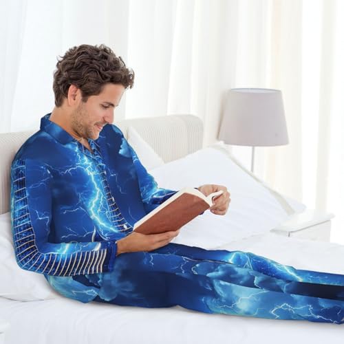 Electric Guitar With Lightning Mens Pajamas Set Button Down Sleepwear Set Long Sleeve Loungewear With Pockets 1