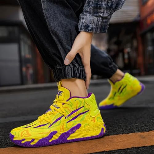 HOT ! Men's Light Blue High-Top Basketball Shoes with Floral Patterns – Breathable Mesh, Non-Slip Cushioned Sole | Lightweight Gym & Outdoor Sneakers (Yellow -Purple,8.5)