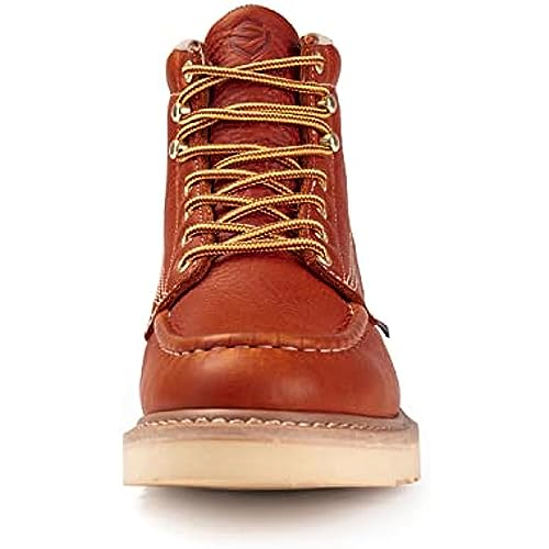 • Luxury Quality Full Grain Leather:Sureway wedge moc toe work boots use genuine full-grain leather uppers for the perfect blend of ruggedness and softness.Unlike synthetic materials,full-grain leather has natural waterproofing and allows for natural airflow,which helps prevent foot odor and keep feet cool,while also keeping them dry and comfortable in moist environments.Pre Oiled leather develops a more desirable look as it ages gracefully.True to size.Go up half a size if you have a wide feet.