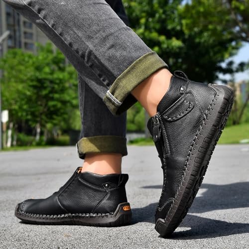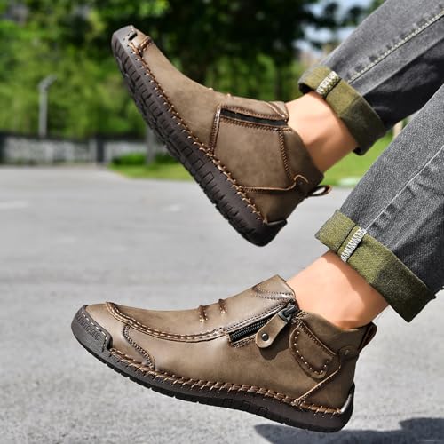 Men's Classic Vintage Hand-stitched Side Zipper Ankle Boots Fashion Comfortable Slip Resistant Casual Loafers Outdoor Driving High Top Flat Shoes 5