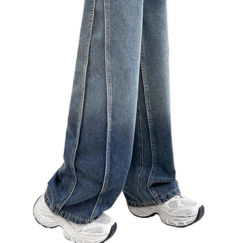 HOT ! Spliced Jeans for Tween Girls, Elastic Waist Gradient Wash Denim Baggy Pants, 4 Pockets Wide Leg Vintage Trousers